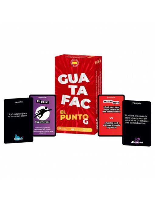 Tras el éxito del original GUATAFAC, los creadores decidieron crear una nueva obra de arte, siguiendo las incesantes peticiones de su gran comunidad de jugadores. De hecho, Guatafac es un juego que se ha hecho viral a través de las redes sociales como Instagram y Tiktok. El nombre, el diseño, las innovaciones y contenido de las cartas fueron seleccionados y sugeridos por su comunidad. ¡NUEVO! TEMÁTICAS DISTINTAS PARA ANIMAR TUS FIESTAS En GUATAFAC : El Punto G, tienes 8 segundos para descubrir los pensamientos más profundos de tus amigos, familiares o incluso extraños. Podrás encontrar 480 cartas con diferentes categorías como: tranquileo, confesión, hot y resacón, además de “Verdad vs Reto” o “El friki”.