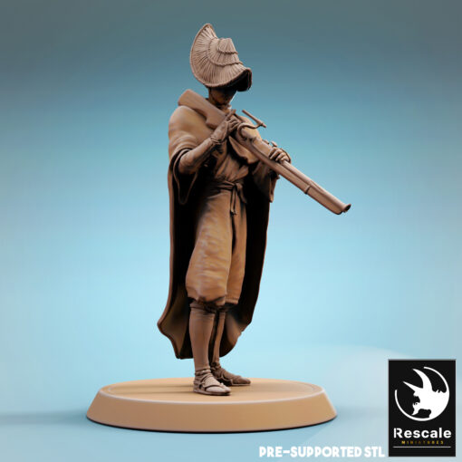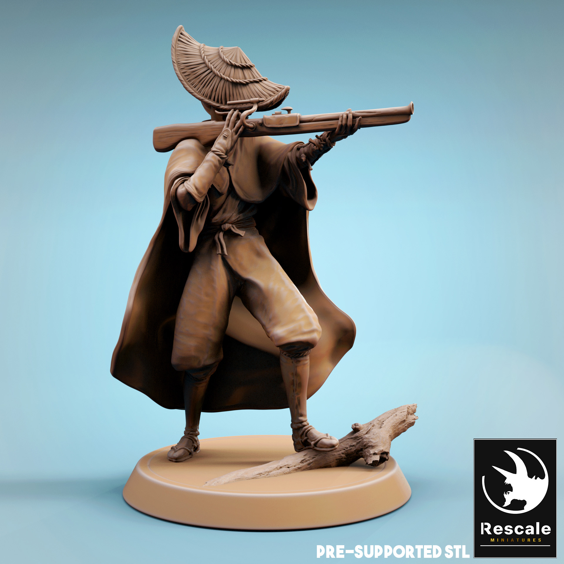 La miniatura representa una arcabucera de estilo japonés en peana de 1 pulgada.