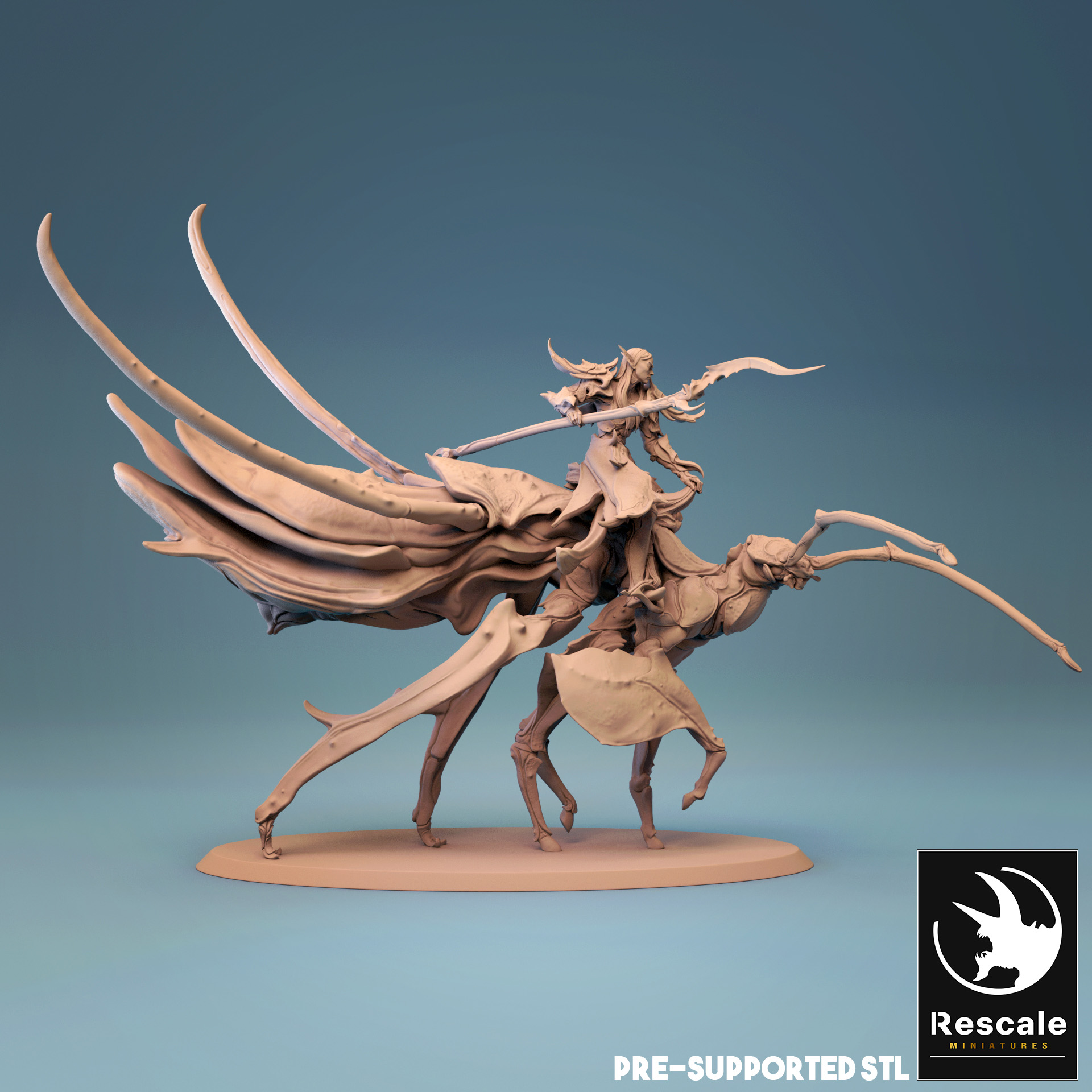 La miniatura representa un capitán de los jinetes élficos de insectos, con una base de 100mm..
