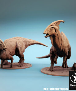 La miniatura representa a un parasaurolophus, con una base de 4 pulgadas.