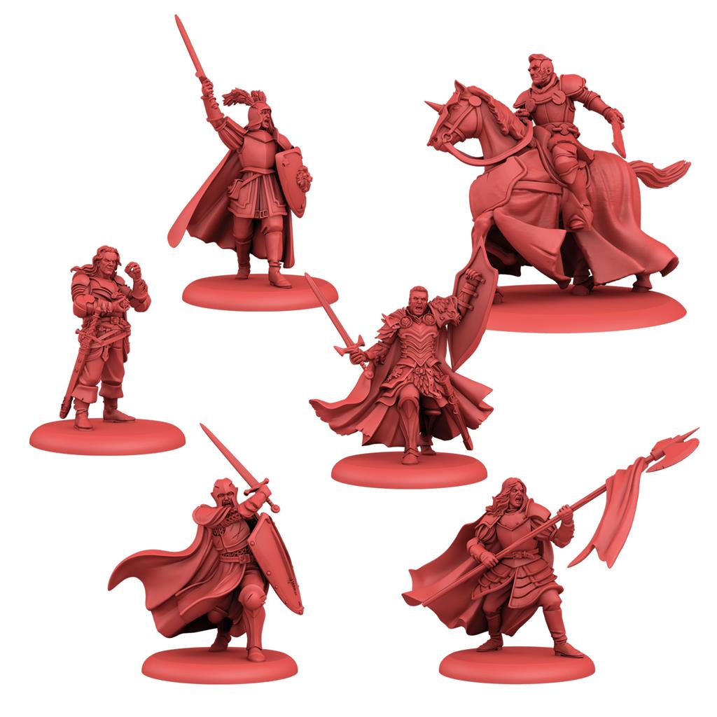 Las ilimitadas reservas de oro que hay bajo Roca Casterly fluyen a raudales hacia la Guerra de los Cinco Reyes y con ellas se contrata a las mejores tropas que el dinero puede comprar. Los soldados profesionales de la Casa Lannister son duros y disciplinados, y siempre están listos para derramar la sangre de sus enemigos a cambio de una paga. Además de estar equipados con las mejores armas y armaduras, los oficiales Lannister están versados en ponerse en primera línea de combate para liderar a sus hombres y en mantenerlos centrados en la batalla. Si algo se les puede reprochar a las tropas de los Lannister, es que no hay dinero que pueda comprar la lealtad; aunque, no obstante, lo que sí que compra el dinero es una enorme cantidad de acero.