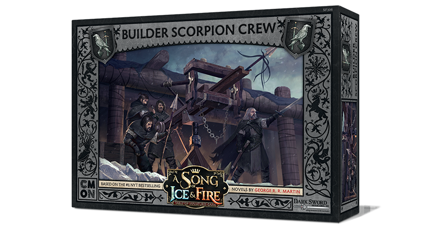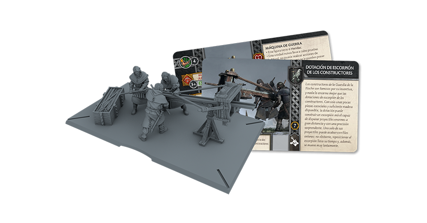 Los constructores fabrican todas las formidables defensas de la Guardia de la Noche, incluidas las armas de asedio, y también se encargan de su mantenimiento. Aunque el escorpión no es más que el hermano pequeño de las enormes balistas montadas en lo alto del Muro, es perfectamente capaz de disparar un proyectil de tamaño considerable a una gran distancia y con efectos letales. Es fácil de cargar y de apuntar y puede segar filas enteras de tropas enemigas con facilidad. Sin embargo, desplazar este pesado artefacto por terreno escabroso no es tarea sencilla. Además, una dotación de escorpión expuesta a la caballería o a los ataques a distancia no durará mucho en el campo de batalla.