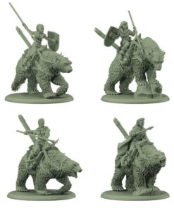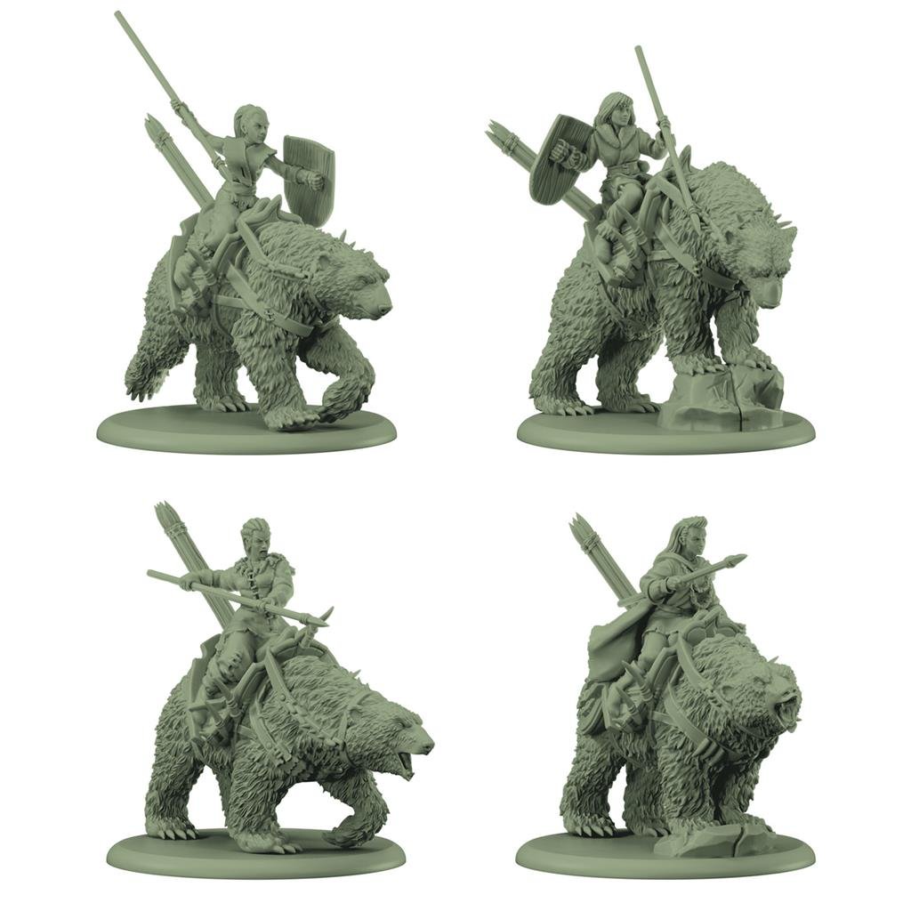 Los osos blancos de las tierras de más allá del Muro son gigantescos incluso comparados con los osos comunes, ya que suelen ser tan altos como dos hombres cuando se alzan a dos patas y son capaces de hender tanto la roca como el acero. Así pues, solo a los salvajes se les ocurriría domesticar a tales bestias y montarlas en combate. En términos de «caballería», las jinetes de oso de la Costa Helada son lentas y se mueven con pesadez; sin embargo, mientras que un caballo se limita a pisotear al enemigo, los osos de las nieves pueden morder, desgarrar y aniquilar hasta el punto de que ni siquiera un hombre equipado con armadura completa es rival para un oso. A pesar de esto, si una unidad de jinetes de oso acaba enzarzada en un combate, la mera superioridad numérica de su oponente puede hacer que caiga abatida. En cualquier caso, como tropa flanqueadora apenas tiene igual, ya que una unidad de jinetes de oso no puede ignorarse sin más.