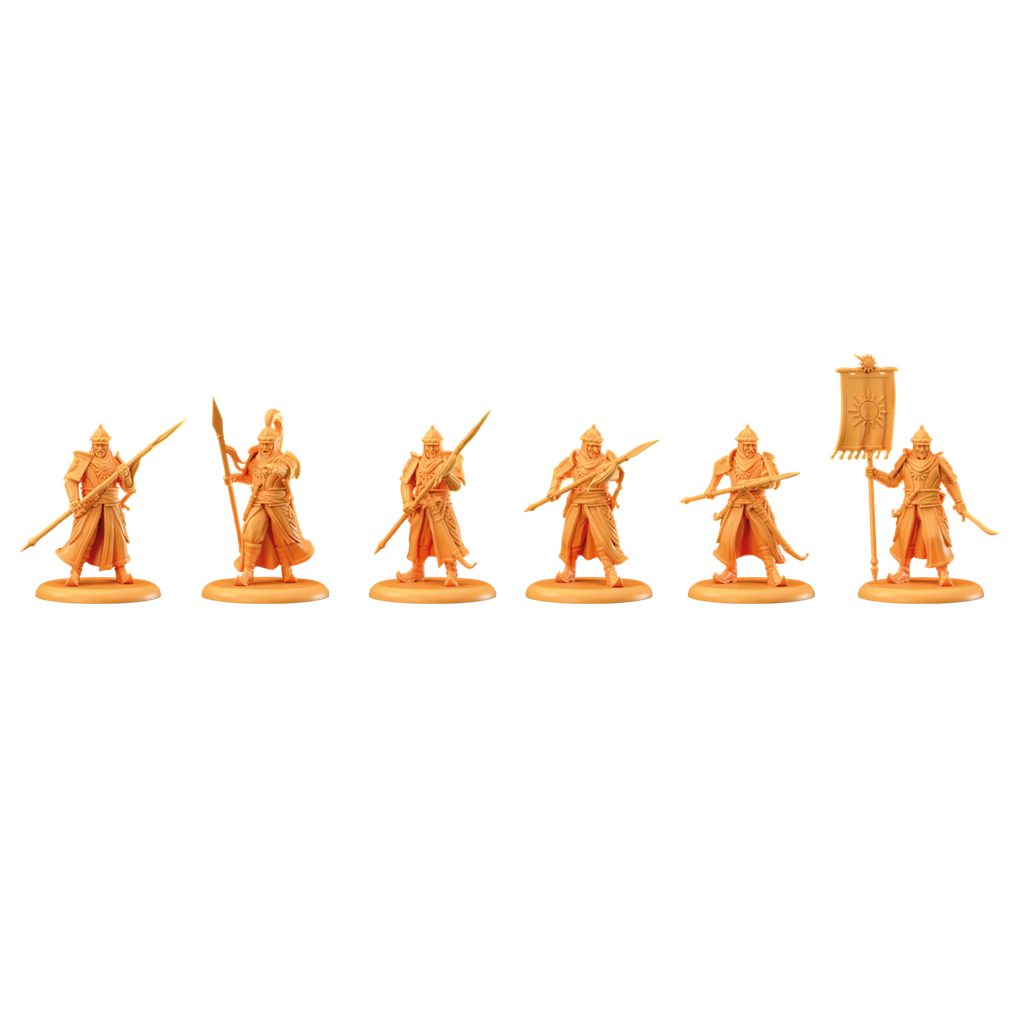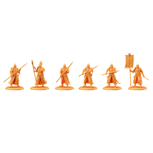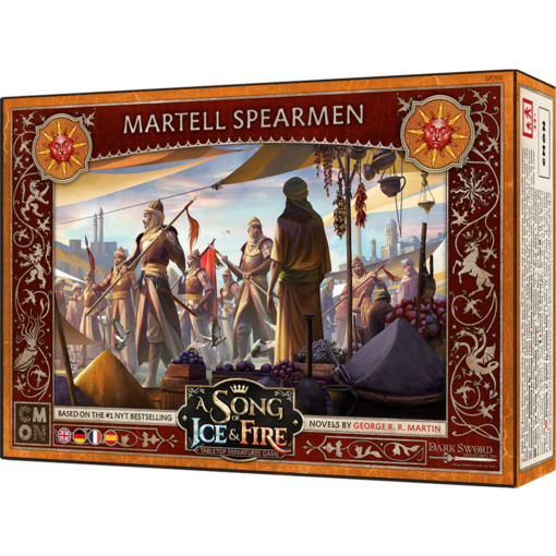 13 miniaturas: 1 Capitán de los Lanceros, 1 Abanderado de los Lanceros Martell, 11 Lanceros Martell. 2 cartas: 1 carta de unidad Combatiente, 1 carta de Vínculo, 1 bandeja de movimiento.